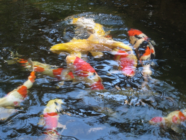 古木水潭,水潭邊種上一些萬年青、滴水觀音、鳥巢蕨,水里漂著鳳眼蓮、水里的金魚和水藻。像深山瀑布落下,波光蕩漾。